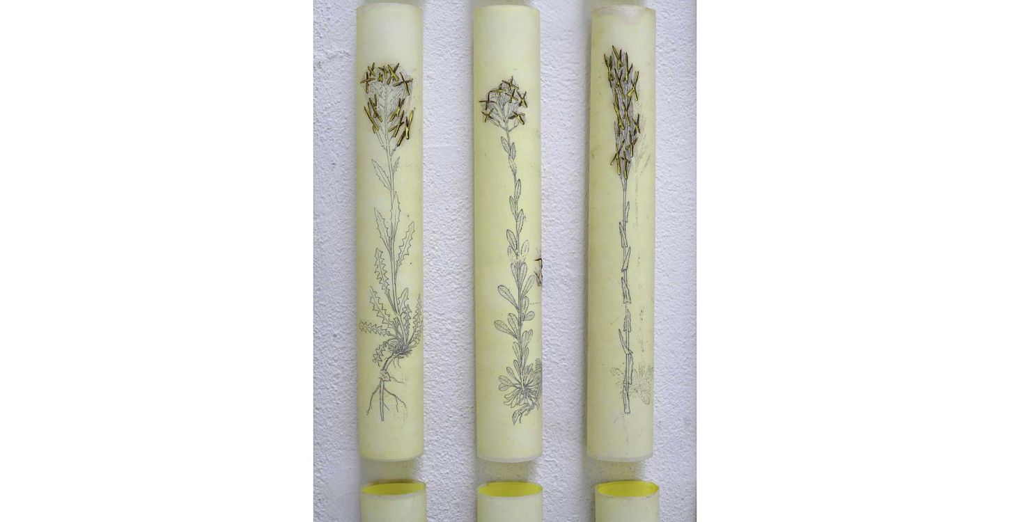 Die Bienenpflanzenröhren bestehen aus feinem, leicht transparentem Wachspapier. Auf jeder Röhre ist eine andere Bienenpflanze abgebildet. Das vergrößert kopierte Pflanzenmotiv wird in Mischtechnik überarbeitet. Durch Schneiden, Reißen oder Herausbrennen sind charakteristische Eigenschaften, vor allem des Blütenbereichs der jeweiligen Pflanzenfamilien, herausgearbeitet.