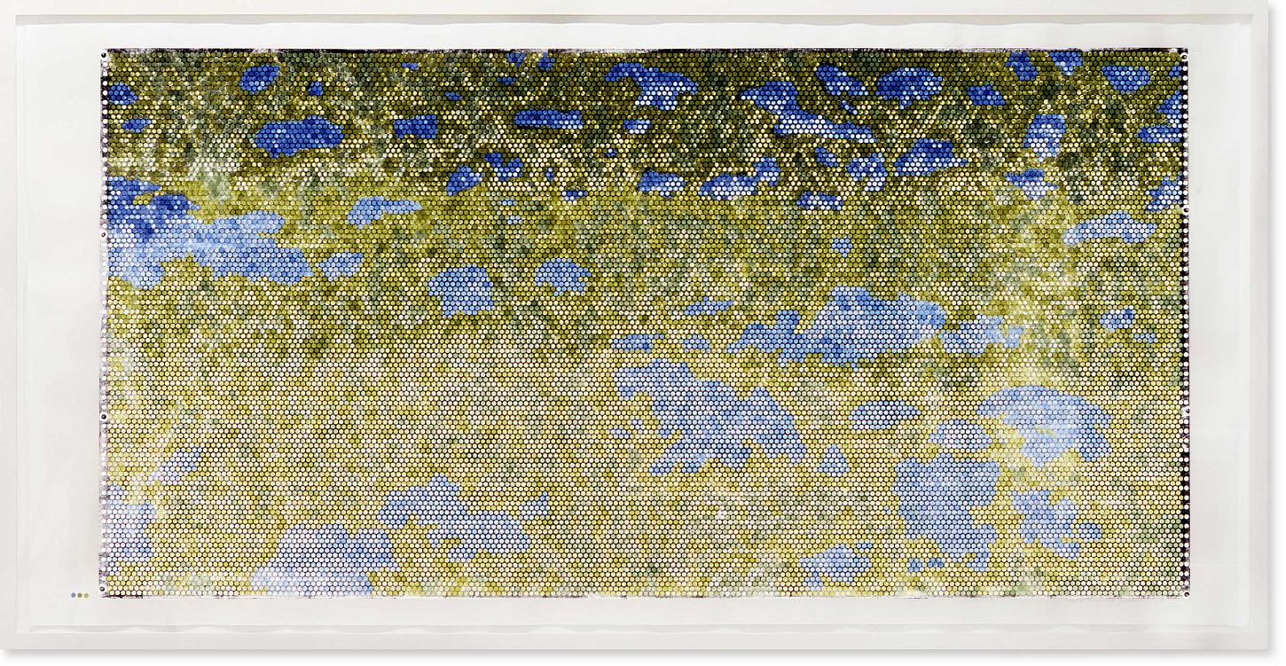 Durch das mehrschichtige Drucken von Hand mit Kartoffelstempeln und farbiger Tusche entstehen kontinuierliche Farbverläufe. Kleine Unregelmäßigkeiten bei der manuellen Bearbeitung lassen eine organisch und malerisch wirkende Bildoberfläche entstehen. Von Nahem ist dies eine abstrakte farbige Fläche. Beim Betrachten aus der Entfernung werden Blumenwiesen, Blüten oder Bereiche um die Nektarien sichtbar.